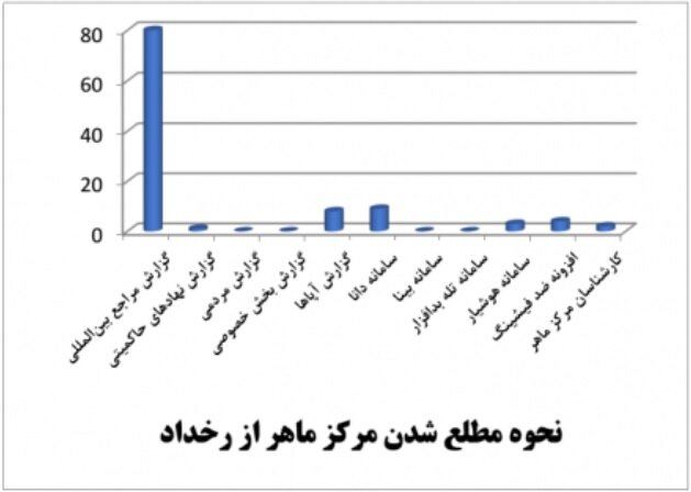 نحوه مطلع شدن مرکز ماهر از رخداد نیز در نمودار زیر آمده که نشان میدهد بیشترین آمار از طریق گزارشهای بینالمللی به این مرکز رسیده است.
