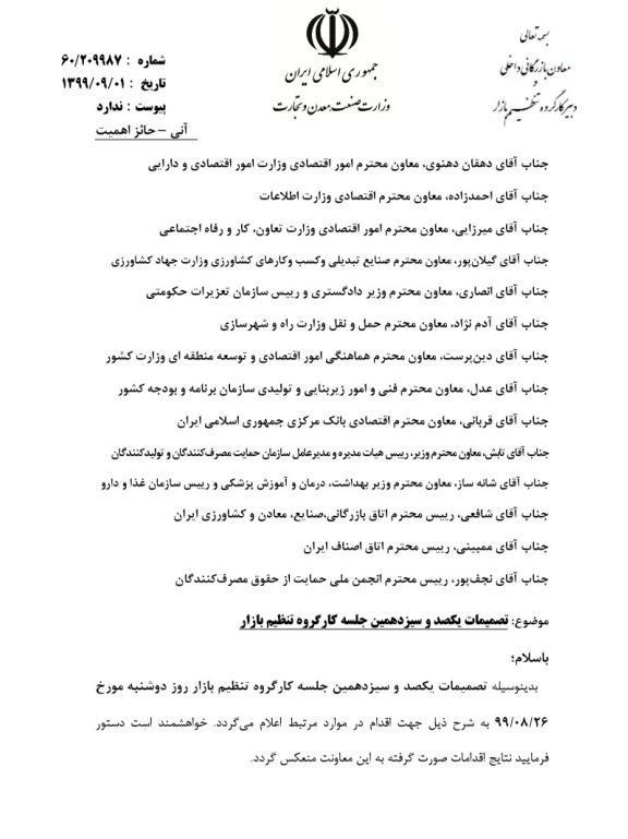 به گزارش سایت طلا به نقل از تسنیم،تصمیمات یکصد و سیزدهمین جلسه کارگروه تنظیم بازار درحالی اول آذرماه در قالب بخشنامه از سوی معاون بازرگانی داخلی وزارت صنعت، معدن و تجارت به دستگاههای اجرایی ابلاغ شد که براساس آن مجوز گرانی حداقل 20 قلم کالا رسماً با امضای دولت به بازار داده شده است.