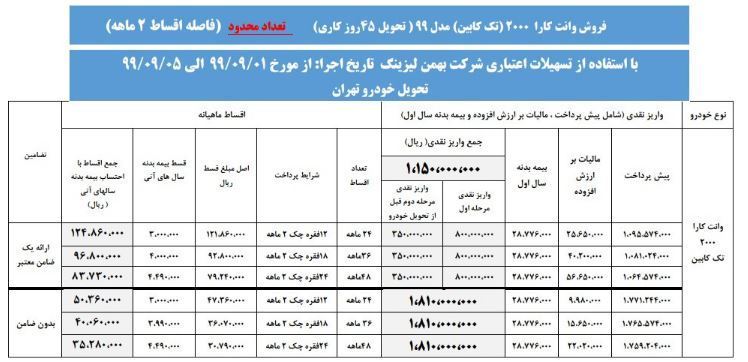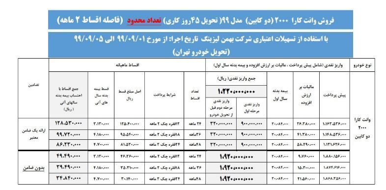 بنابر گزارش گروه بهمن موتور ، این شرکت شروع به فروش اقساطی وانت کارا 2000 تک کابین و دوکابین کرده است. گروه بهمن موتور مدت زمان تحویل خودرو ها را 45 روزه اعلام کرده است.