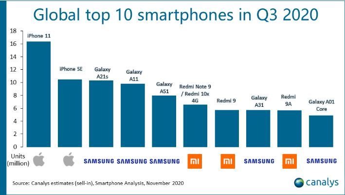 موسسه تحقیقاتی Canalys آخرین گزارش در مورد بازار جهانی تلفن های هوشمند در سه ماهه سوم سال 2020 را منتشر کرد. بر اساس این تحقیق ، دو گوشی هوشمند پرفروش در جهان در طی سه ماه اول امسال آیفون بودند.