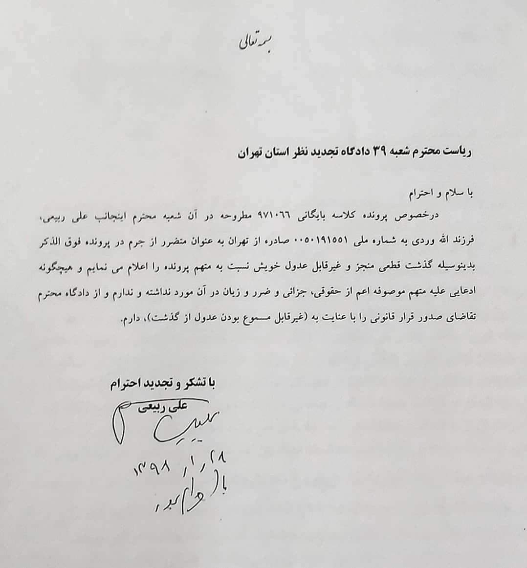 ربیعی همچنین تصویر نامه ذیل را در توئیت جداگانهای منتشر کرده است.