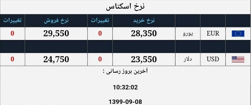 قیمت یورو نیز برای فروش در صرافی ملی 29550 تومان اعلام شده؛ قیمت خرید یورو نیز در این صرافی 28350 قیمت خورده است.