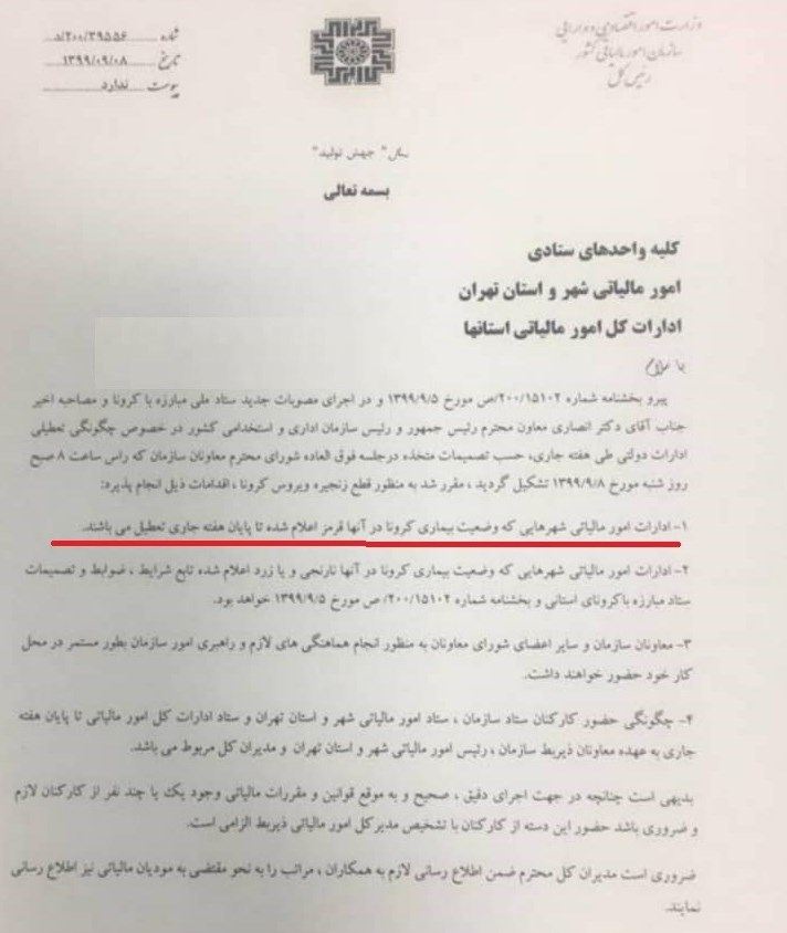 بر اساس ابلاغیه رئیس سازمان امور مالیاتی، ادارات کل این سازمان در مناطق با وضعیت قرمز کرونایی یک هفته تعطیل شدند.