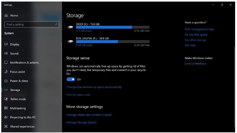 حتی یک روش جدیدتر برای حفظ استفاده از فضای ذخیره سازی ، فعال کردن گزینه Storage Sense است (تصویر بالا را ببینید). با پاک کردن پرونده های موقتی و موارد سطل آشغال ، این به طور خودکار فضا را آزاد می کند.