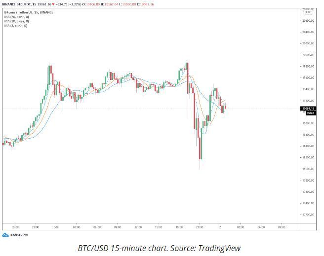 قیمت BTC پس از سقوط به حدود 18200 دلار به سرعت بهبود یافت و در عرض چند ساعت به بالای 19،400 دلار رسید.