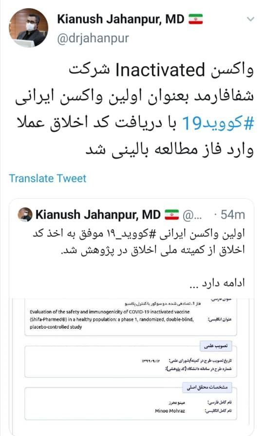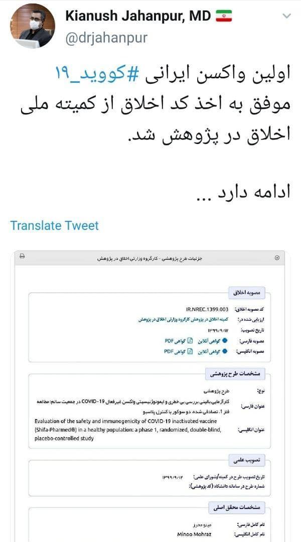 کیانوش جهانپور سخنگوی سازمان غذا و دارو با اشاره به مجوز انسانی واکسن کرونا در پیام توییتری نوشت: اولین واکسن کووید ۱۹ در ایران موفق به اخذ کد اخلاق از کیمته اخلاق در پژوهش شد.
