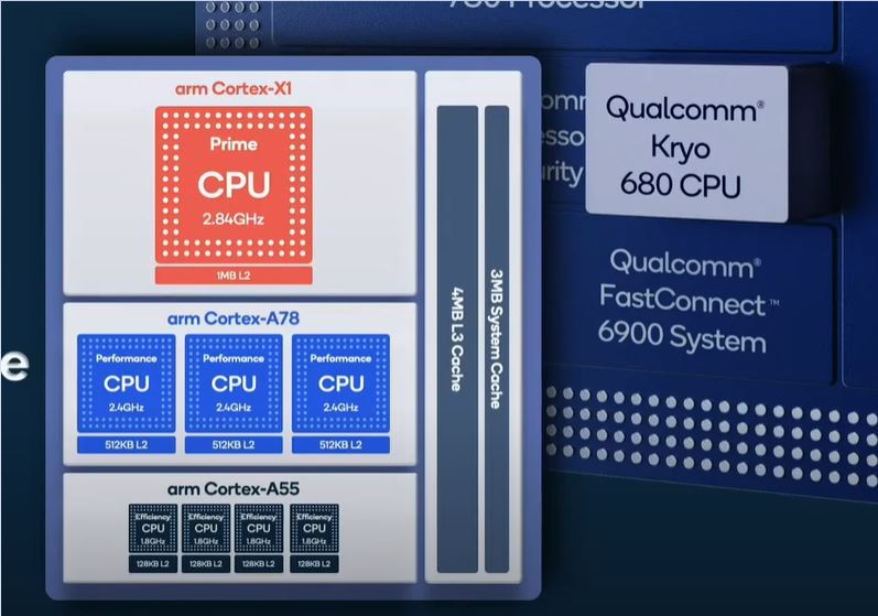 این تراشه دارای پردازنده مرکزی Kryo 680 است که به گفته کوالکام 25 درصد قدرتمندتر و 25 درصد کارآمدتر از نسل قبلی است. هسته اصلی بر اساس طراحی Cortex-X1 Arm است و حداکثر سرعت کلاک 2.84GHz را ارائه می دهد. با سه هسته Cortex-A78 و چهار هسته Cortex-A55 همراه است.