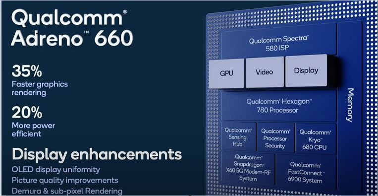 SoC GPU Adreno 660 را تعبیه کرده است و کوالکام ادعا می کند که در مقایسه با پردازنده گرافیکی Snapdragon 865 در واقع 35 درصد گرافیک سریعتر و 20 درصد بهره وری انرژی بهبود یافته ارائه می دهد.