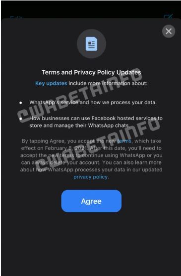در گزارش خود ، WABetaInfo تصاویر صفحه ای را به اشتراک گذاشت که نشان می دهد شرایط و خط مشی رازداری به روز می شود. این گزارش نشان داد که به روزرسانی های اصلی شامل اطلاعات بیشتری در مورد سرویس WhatsApp و نحوه پردازش داده های کاربر است. همچنین شامل اطلاعاتی در مورد چگونگی استفاده مشاغل از خدمات میزبان فیس بوک برای ذخیره و مدیریت گپ ها می باشد.