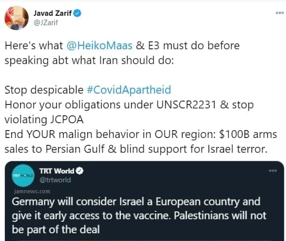 ظریف همچنین با اشاره به اظهارات "هایکو ماس" وزیر امورخارجه آلمان درباره ضرورت توافق فراتر از برجام با ایران نوشت: هایکو ماس و تروئیکای اروپا باید قبل از حرف زدن در مورد ایران این کارها را انجام دهد: آپارتاید کرونایی نفرت انگیز را متوقف کنید، به تعهدات خود ذیل قطعنامه شورای امنیت پایبند باشید و دست از نقض برجام بردارید و از رفتارهای مخرب خود در منطقه ما و فروش ۱۰۰ میلیارد دلار تسلیحات به کشورهای خلیج فارس و حمایت کورکورانه از اعمال تروریستی اسرائیل دست بردارید.