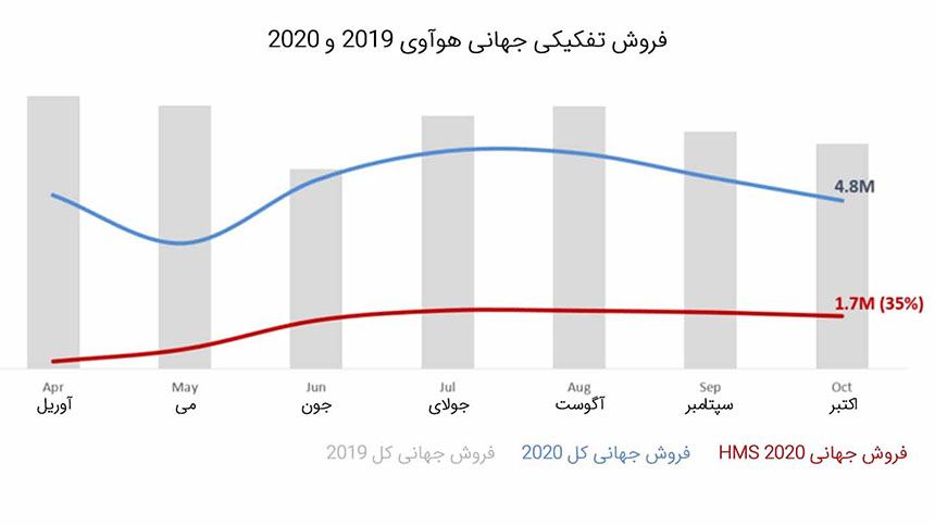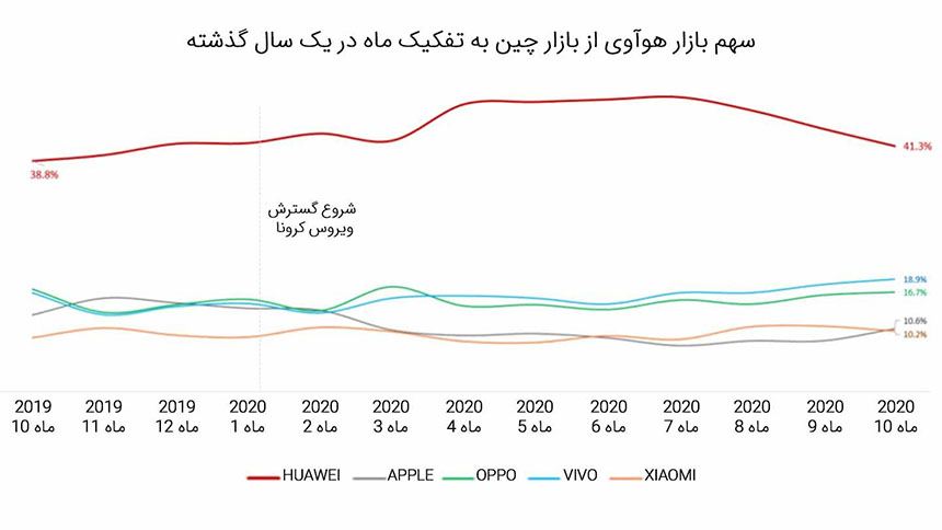 اما بر اساس گزارشهای مالی سهماهه سوم سال 2020، سهم بازار هوآوی در بازار گوشی هوشمند چین حدود 41.4 درصد بوده است. این یعنی هوآوی سهمی بیش از دوبرابر نسبت به نزدیکترین رقیب خود در این بازار دارد. این شرکت در این دوره موفق به ارسال بیش از 35 میلیون دستگاه گوشی هوشمند به بازار شده است.