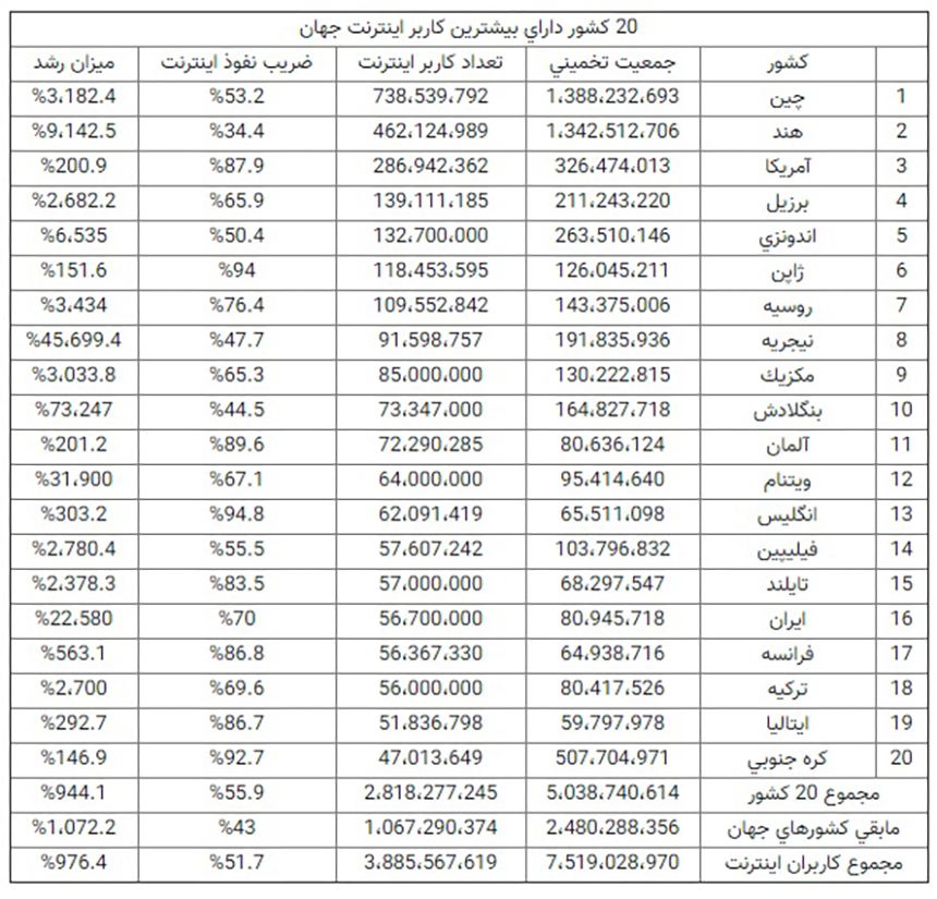 ایران در جمع ۲۰ کشور پرکاربر اینترنتی در دنیا