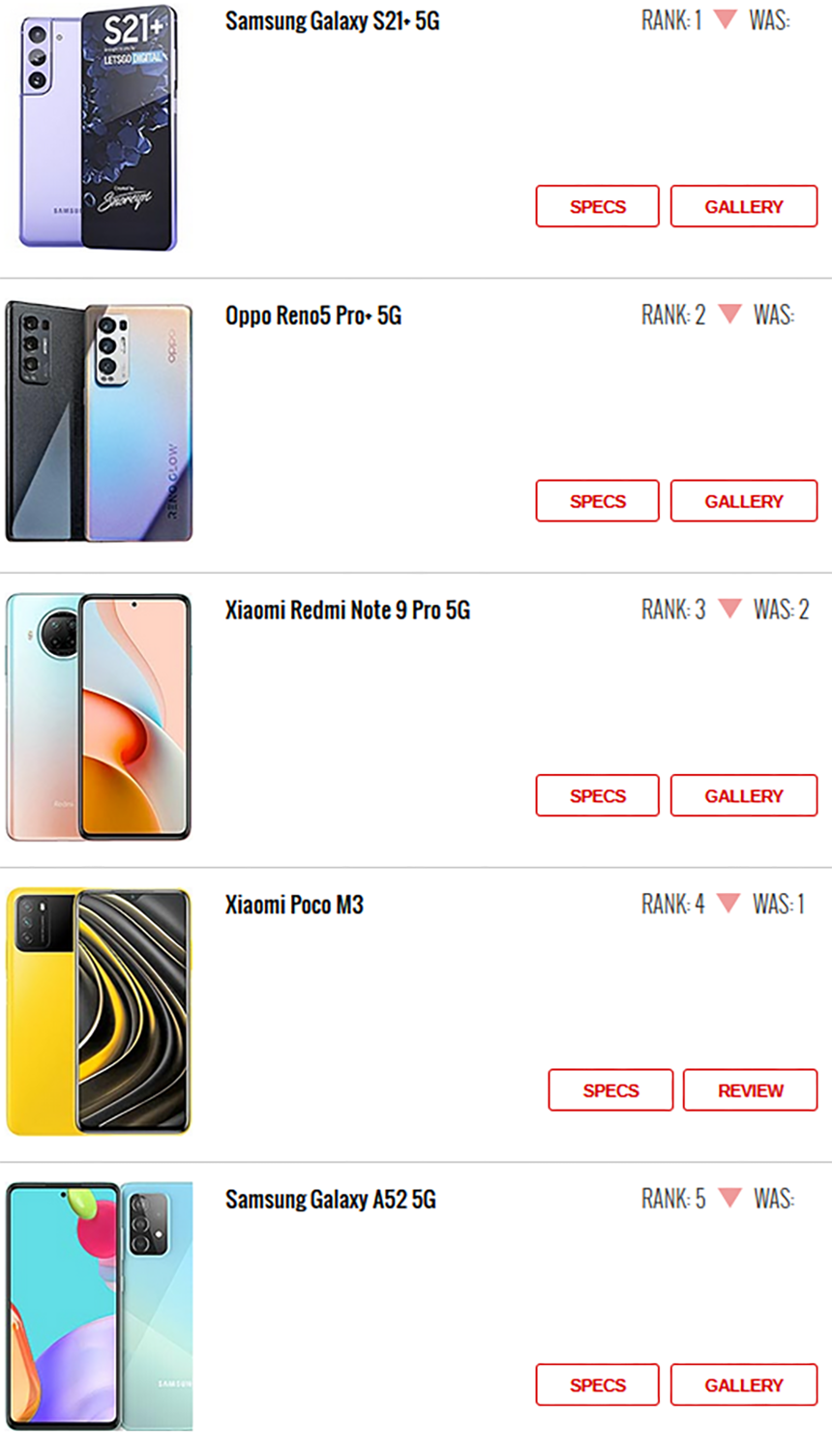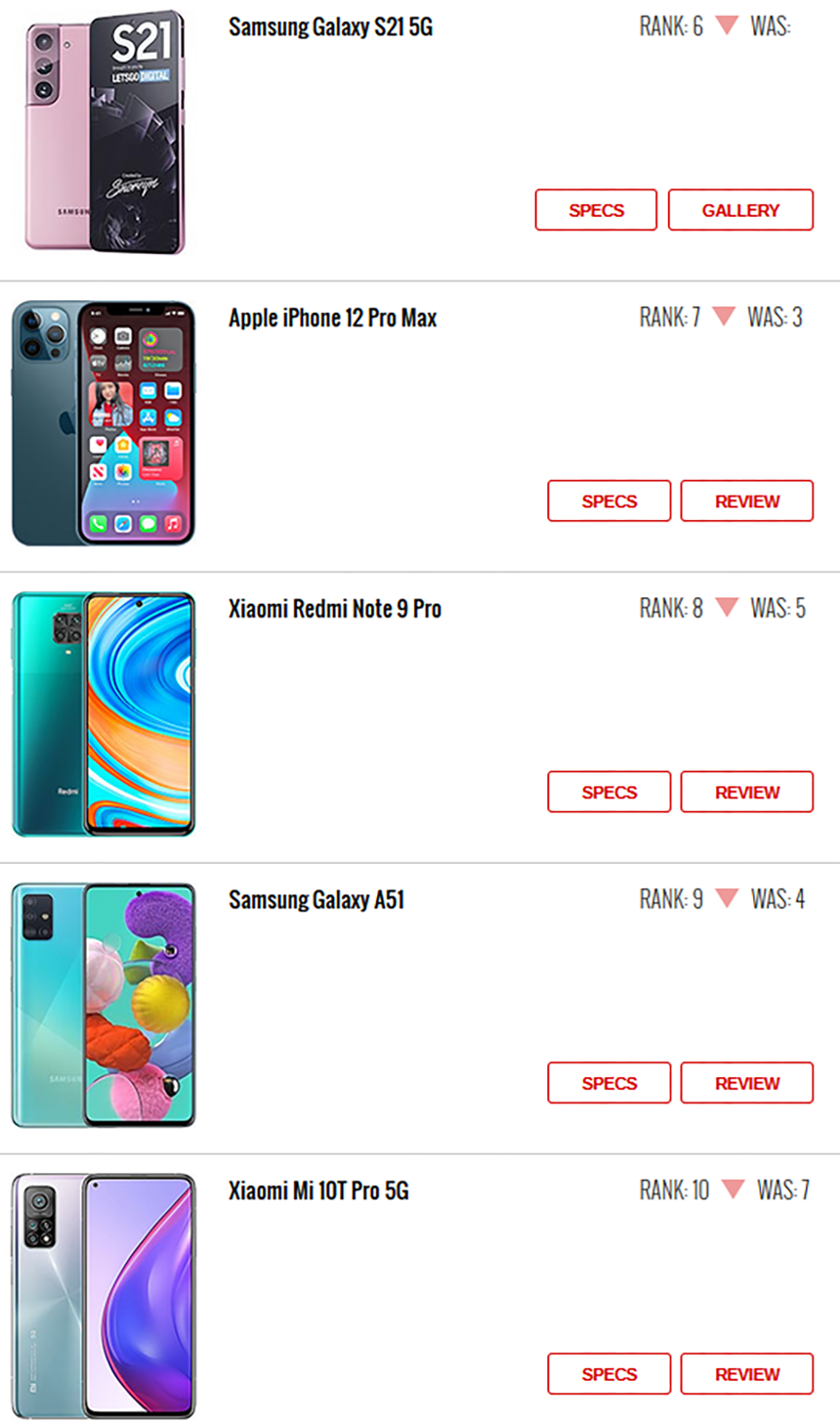 پنجمین گوشی موجود در این فهرست نیز به گوشی معرفی نشده سامسونگ یعنی Galaxy A52 تعلق گرفته است که در هفته گذشته شاهد انتشار اطلاعات خاصی ا زآن در فضای مجازی بودیم. ششمین جایگاه نیز به عضو دیگری از خانواده پرچمداران آینده سامسونگ یعنی Galaxy S21 تعلق دارد و به واسطه شایعات در این رتبه قرار دارد.