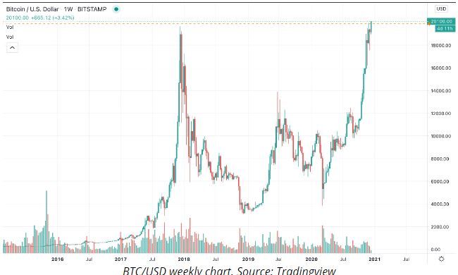 قیمت بیت کوین (BTC) در 16 دسامبر برای اولین بار در تاریخ به 20 هزار دلار رسیده است. این نقطه عطف تاریخی بیش از دو هفته پس از شکستن بالاترین رقم قبلی خود است. در همان زمان ، این رالی با چندین دلیل متفاوت است که می تواند به افزایش BTC کمک کند. این موارد شامل تقاضای نهادی رو به رشد ، درک روزافزون سرمایه گذاران مبنی بر اینکه BTC ذخیره ارزش است و مبانی شبکه قوی تر است.