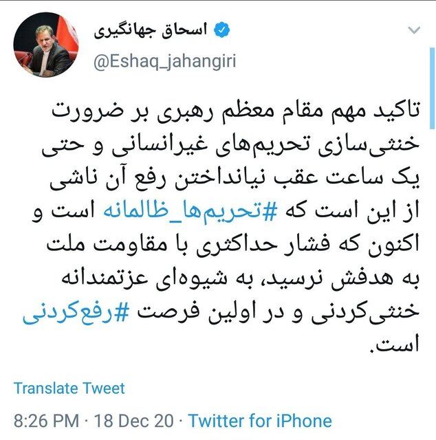 جهانگیری: تحریمهای ظالمانه خنثیکردنی و رفعکردنی هستند