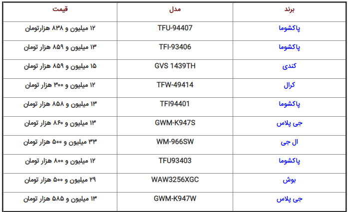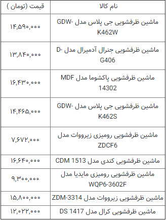 قیمت برخی از انواع ماشین ظرفشویی و لباس شویی در بازار به شرح زیر است: