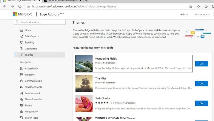 Edge در حال حاضر از نصب طرح زمینه های Chrome از فروشگاه وب گوگل پشتیبانی می کند. پس از افزودن گزینه تم رنگی به Edge ، این بار مایکروسافت بی سر و صدا موضوعات مختلف در باب بازی را در فروشگاه افزودنیهای Edge منتشر کرده است و برای تغییر شکل مرورگر Edge و همچنین صفحه New Tab گزینه های جدیدی را در دسترس قرار داده است. از زمان نوشتن ، علاوه بر تم Wonder Woman 1984 ، فروشگاه شامل مضامین Halo ، Microsoft Flight Simulator ، Forza Horizon 4 ، Gears 5 ، Sea of Thieves ، Ori و Will of the Wisps و موارد دیگر است.