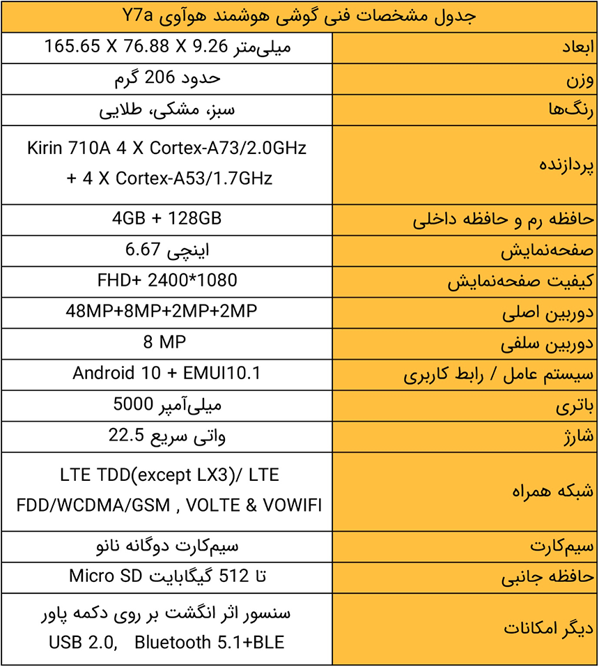 هوآوی Y۷a در آینده نزدیک در دسترس علاقه‌مندان در بازار ایران قرار خواهد گرفت. در ادامه با این گوشی هوشمند جدید هوآوی آشنا خواهیم. اما قبل از آن جدول کامل مشخصات هوآوی Y۷a در ادامه آمده است.