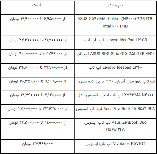جدیدترین قیمت انواع لپ تاپ در بازار
