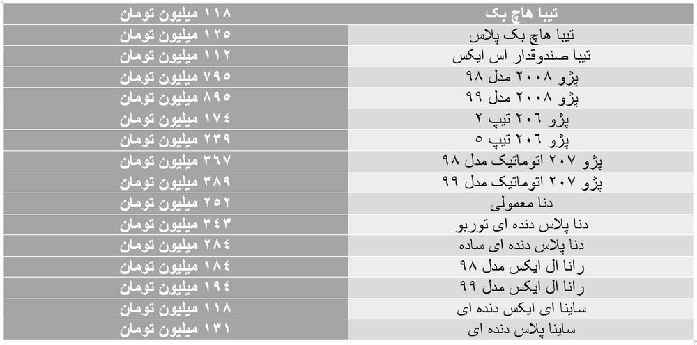در بین انواع مدل های تیبا، تیبا هاچ بک از ۱۲۲ میلیون تومان در اواخر آذر ماه امروز به قیمت ۱۱۸ میلیون تومان رسیده است و یا تیبا هاچ بک پلاس در حالی امروز ۱۲۵ میلیون تومان قیمت خورده است که این خودرو در اواخر آذر ماه به قیمت ۱۳۱ میلیون تومان معامله می شده است؛ در بین انواع مدل های خودرو پژو، پژو ۲۰۶ تیپ ۲ از ۱۸۲ میلیون و ۵۰۰ هزار تومان امروز به قیمت ۱۷۴ میلیون تومان رسیده است و پژو ۲۰۶ تیپ ۵ نیز از ۲۴۸ میلیون تومان امروز به قیمت ۲۳۹ میلیون تومان رسیده است و پژو ۲۰۷ اتوماتیک مدل ۹۹ نیز در حالی امروز ۳۸۹ میلیون تومان قیمت خورده است که این خودرو در اواخر آذر ماه به قیمت ۴۰۷ میلیون تومان معامله می شده است.