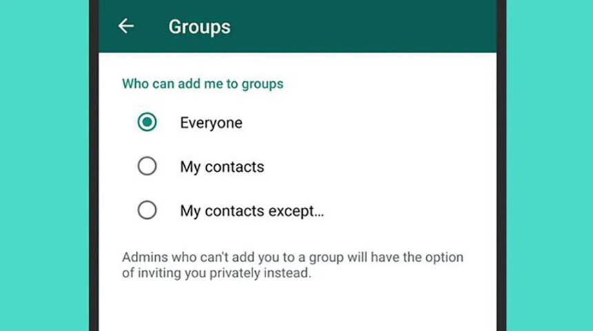 مطمئنا گروههای چت مفید هستند اما شاید مایل نباشید بدون موافقت به هیچ گروهی اضافه شوید. برای این منظور سه نقطه در اندروید یا تنظیمات در iOS را لمس کرده و سپس به بخش اکانت، حریم خصوصی و گروهها مراجعه کنید و مشخص کنید چه کسانی می توانند یا نمی توانند شما را به صورت خودکار به یک گروه اضافه کنند (البته همچنان می توانید برای پیوستن به گروهها دعوت شوید). با انتخاب گزینه به استثنای تماسهای من، فهرست کسانی که می توانند شما را به گروه اضافه کنند را کوتاه کنید.