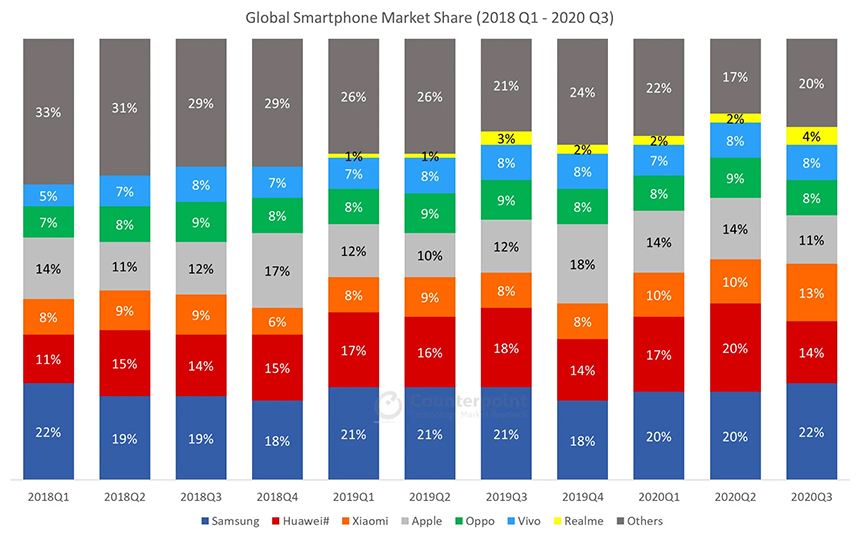 سهم بازار برندهای موبایل در بازار جهانی (سه‌ماهه‌ی اول ۲۰۱۸ تا سه‌ماهه‌ی سوم ۲۰۲۰) منبع: Counterpoint