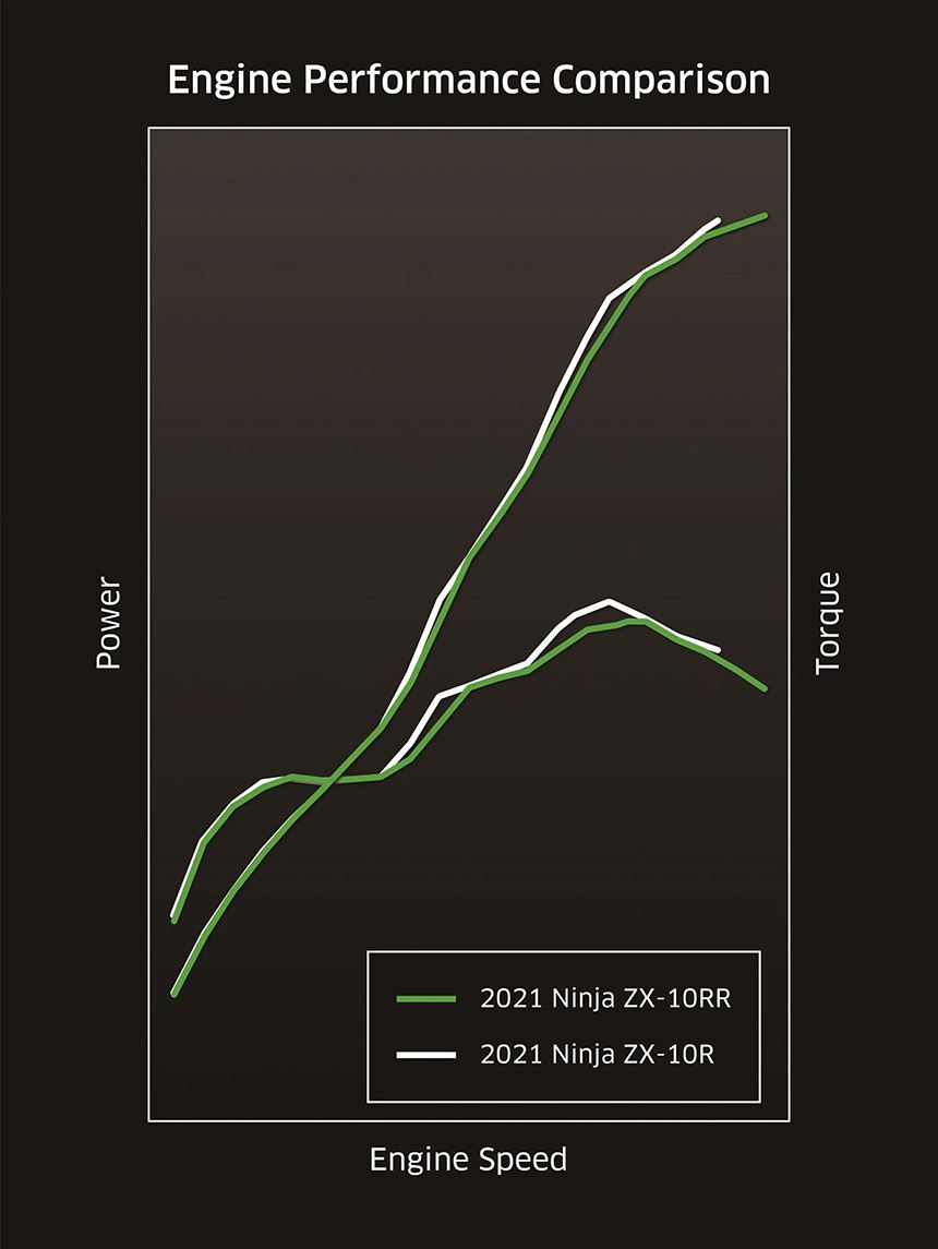 نینجا ZX-10RR که نزدیکی بیشتری با مدلهای حاضر در مسابقات سوپربایک دارد، با میلبادامک اصلاحشده و فنرهای جدید برای سوپاپ ورودی و خروجی، از همتای تک R خود متمایز میشود. کاوازاکی قسمت ورودی هوا را برداشته و شاتونها و پیستونهای تیتانیومی را به پیشرانه اضافه کرده است. این تغییرات محدودیت دور RR را افزایش میدهد؛ اما به نظر میرسد مشخصات قدرت نسبت به خروجی ZX-10R نسبتا بهبود یافته است.