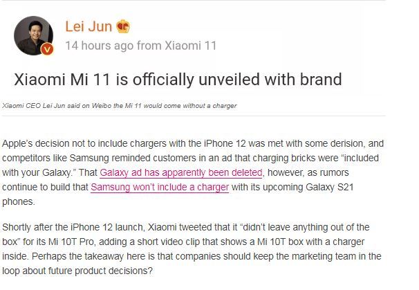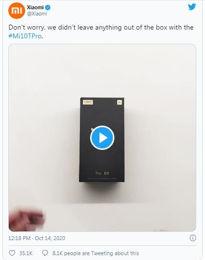 اندکی پس از عرضه آیفون 12 ، شیائومی در توئیتر خود نوشت که "چیزی را از جعبه حذف نمیکند" برای Mi 10T Pro خود ، و یک کلیپ ویدیویی کوتاه اضافه کرد که جعبه Mi 10T را با یک شارژر در داخل نشان می دهد. شاید نکته قابل توجه در اینجا این باشد که شرکت ها باید تیم بازاریابی را در مورد تصمیمات مربوط به محصولات آینده خود آگاه کنند.
