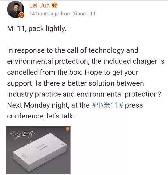 لی جون ، مدیر عامل شرکت سازنده تلفن چینی شیائومی ، با اشاره به نگرانی های زیست محیطی ، تأیید کرد که تلفن Mi 11 آینده آن با شارژر همراه نخواهد شد. گرچه این یک دلیل مشروع علیه تهیه یک تکه پلاستیک دیگر است که شبیه تمام شارژرهای دیگر افراد است ، شیائومی به سایر سازندگان تلفن پیوست که چند ماه پیش به دلیل عدم ارائه شارژر با آیفون 12 ، اپل را مسخره کردند.