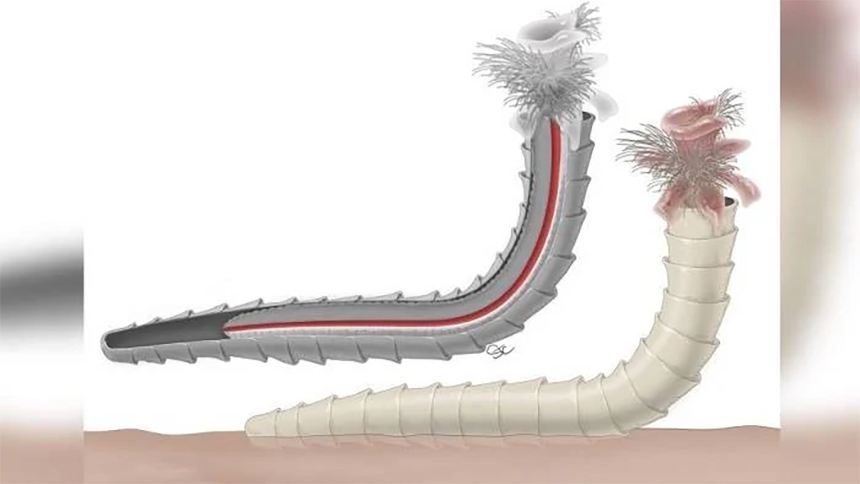 برداشت هنرمند از کلادینومورف باستانی با رودههایی که به رنگ قرمز نشان داده شده است