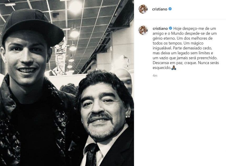 کریستیانو رونالدو بازیکن تیم فوتبال یوونتوس پس از انتشار خبر درگذشت مارادونا در ماه نوامبر، پستی را در صفحه فضای مجازی خود منتشر کرد که ۱۹.۷ میلیون نفر آن را پسندیدند.
