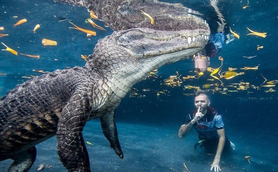 یکی از تصاویر غواصی را نشان میدهد که در نزدیکی یک تمساح قرار دارد.