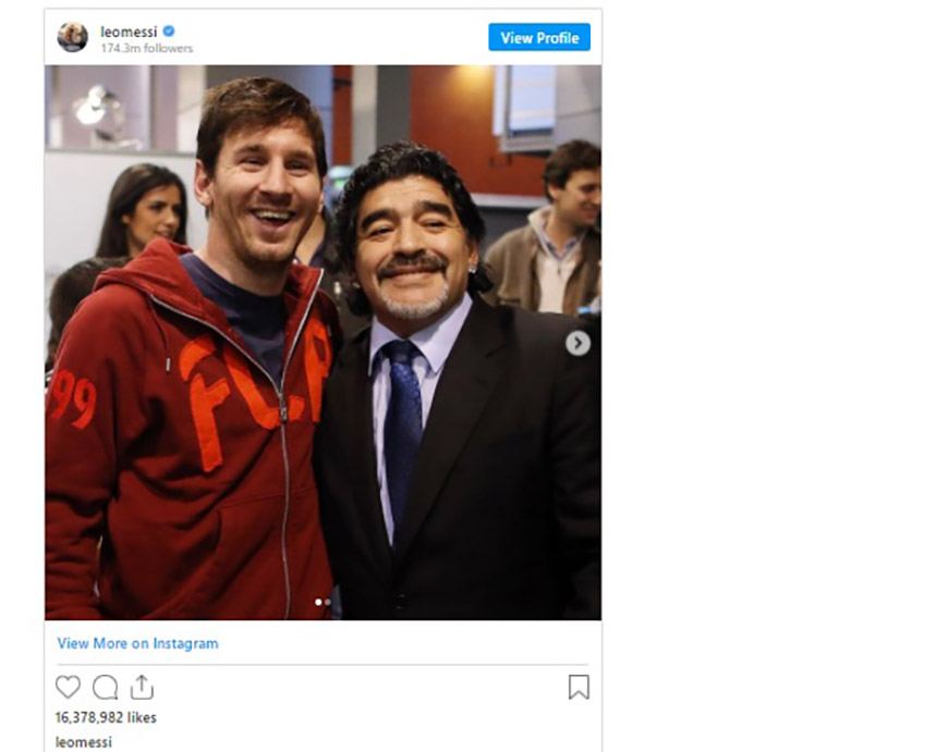 سومین پست محبوب اینستاگرام در سال 2020 نیز به مرگ مارادونا مربوط میشود. لیونل مسی، بازیکن برجسته بارسلونا در تاریخ 25 نوامبر با انتشار عکسی از خودش در کنار مارادونا، به وی ادای احترام کرد و بیش از 16.4 میلیون کاربر این پست لیونل مسی را لایک کردند.