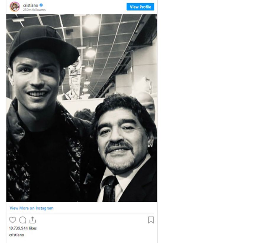 محبوبترین پست اینستاگرام در سال 2020 توسط کریستیانو رونالدو در تاریخ 25 نوامبر به اشتراک گذاشته شده است که بیش از 19.7 میلیون کاربر این شبکه اجتماعی آن را لایک کردهاند. کریستیانو رونالدو با انتشار عکسی با اسطوره فقید فوتبال، «مارادونا» با دوست قدیمی خود خداحافظی کرده است که مورد تایید بسیاری از کاربران در سراسر جهان قرار گرفته است.