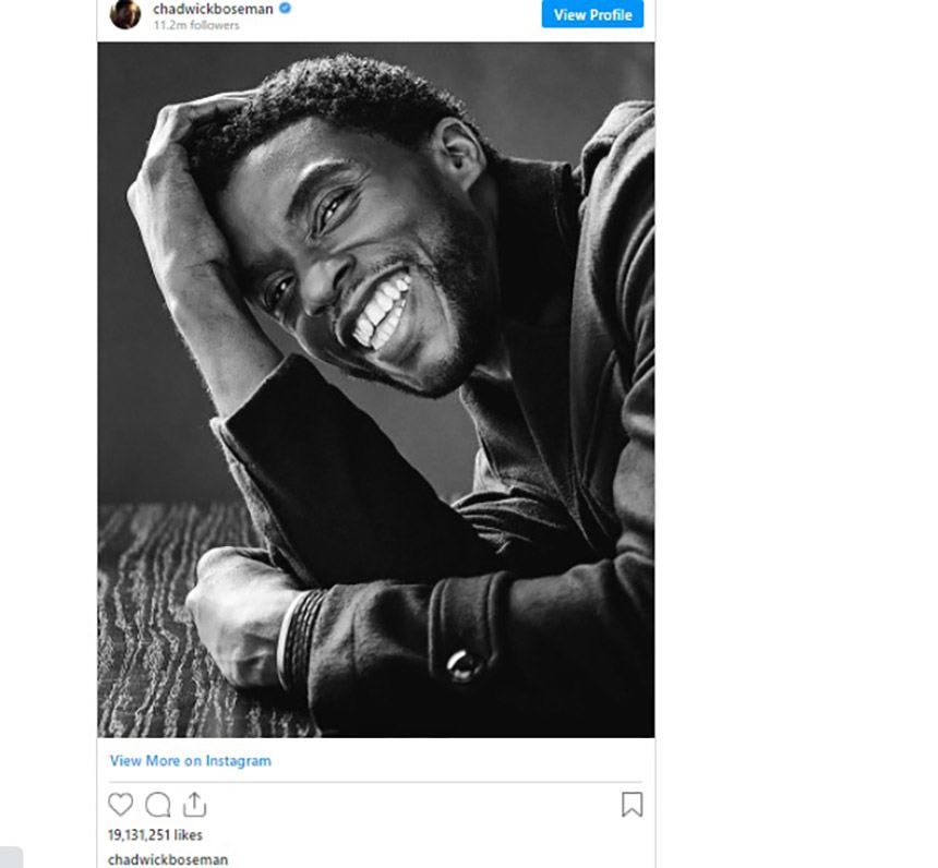 رتبه دوم پرلایکترین پست اینستاگرام به مرگ دلخراش «چادویک بوزمن»، هنرپیشه و تهیه کننده آمریکایی مربوط میشود که در تاریخ 28 آگوست منتشر شده و بیش از 19.1 میلیون کاربر آن را پسندیدهاند. مرگ چادویک بازیگر «پلنگ سیاه» در سن 43 سالگی هواداران وی را شوکه کرد و میلیونها کاربر در سراسر جهان خبر فوت وی را در اینستاگرام لایک کردند.