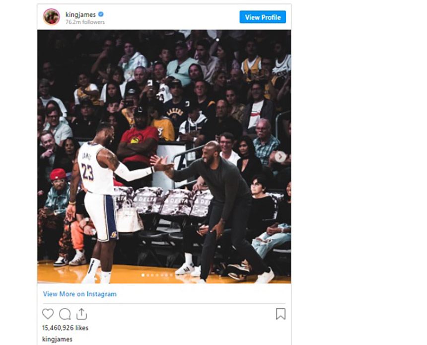 لبران جیمز با انتشار پستی در تاریخ 27 ژانویه 2020 از مرگ ناگهانی یکی از قهرمانان بسکتبال به نام «کوبی برایانت» و دخترش «جیانا» در حادثه هلیکوپتر خبر داد و 15.5 میلیون کاربر این پست را لایک کردند.