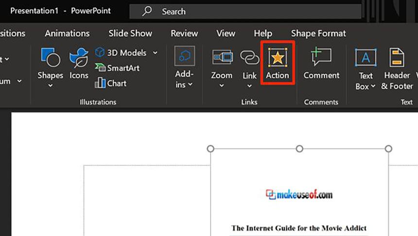 روی منوی Insert در نوار بالایی برنامه کلیک کرده و به دنبال بخش Links باشید. در این بخش روی گزینه Action کلیک کنید.