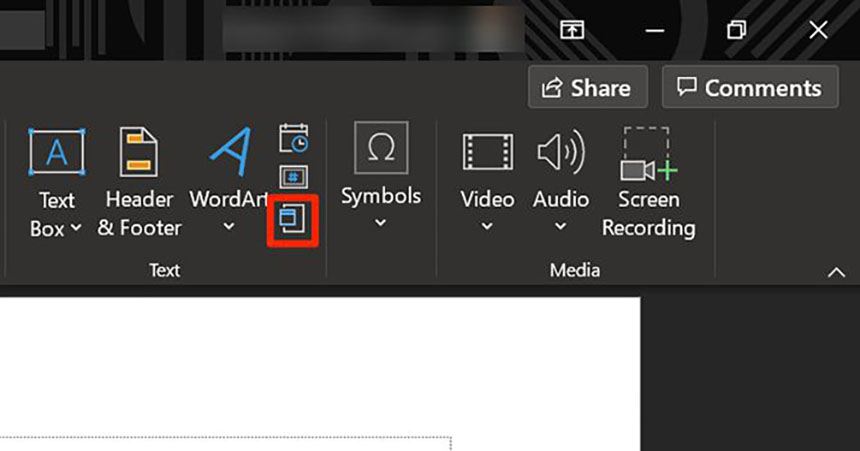 در نوار بالایی گزینه Insert را انتخاب کنید و به سراغ بخشی با عنوان Text بروید. در این بخش روی آیکون Object کلیک کنید.