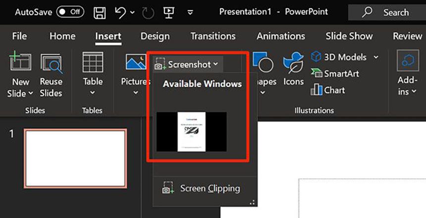 در پاورپوینت روی تب Insert در بالای صفحه کلیک کرده و سپس Screenshot و پنجره Acrobat Reader DC را انتخاب کنید.