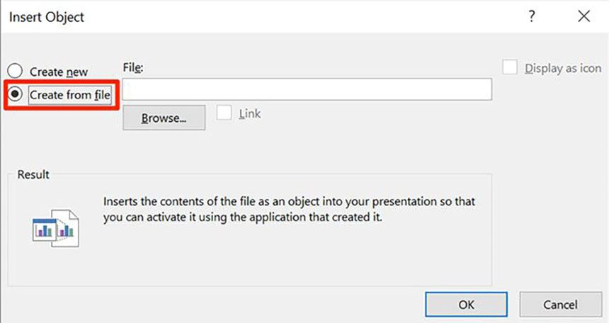 با کلیک روی این گزینه یک پنجره جدید در برابرتان ظاهر میشود که حاوی دو گزینه اصلی است. یکی از آنها مربوط به ایجاد یک Object جدید میشود و دیگری ساخت یک Object به وسیله فایل است. گزینه دوم Create from file را انتخاب کنید چرا که میخواهید به پاورپوینت خود یک فایل PDF اضافه کنید.