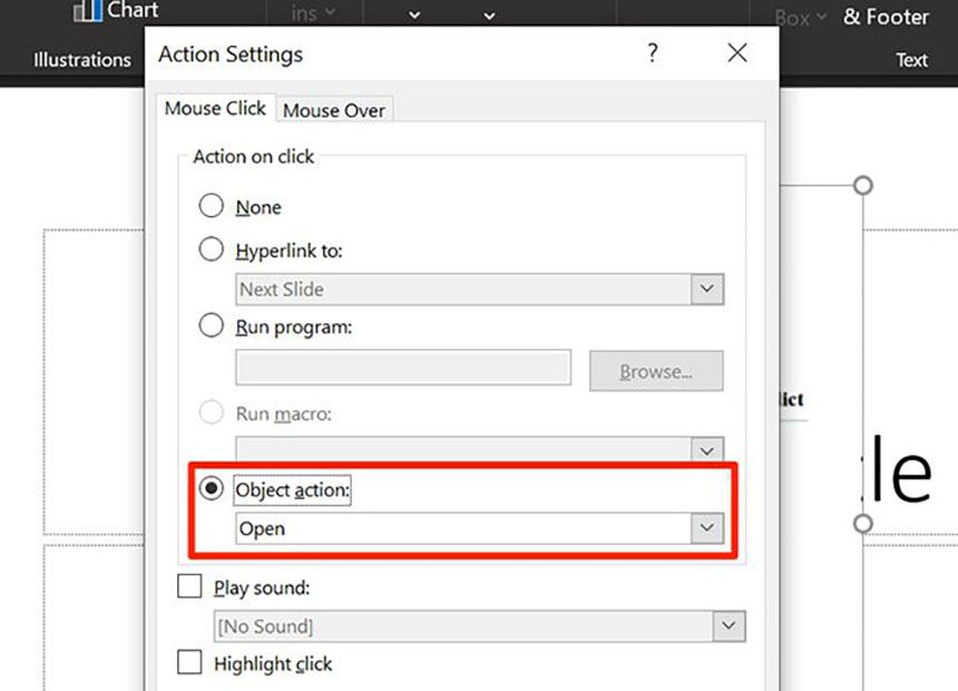 گزینه Object action را فعال کنید و در منوی کشویی زیر آن، گزینه Open را انتخاب کنید. این احتمال وجود دارد که بجای این گزینه با Activate Content مواجه شوید. در نهایت روی گزینه OK در پایین صفحه کلیک کنید.