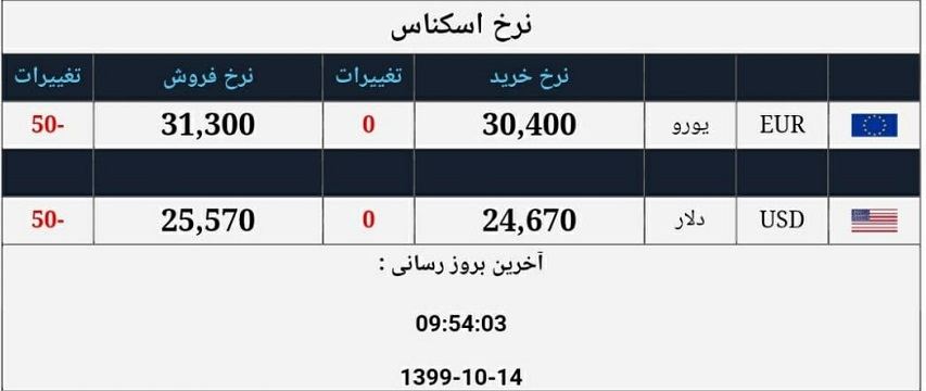 قیمت یورو نیز برای فروش در صرافی ملی ۳۱۳۰۰ تومان اعلام شده؛ قیمت خرید یورو نیز در این صرافی ۳۰۴۰۰ قیمت خورده است.