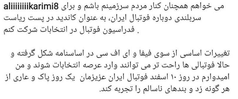 علی کریمی بازیکن اسبق تیم ملی فوتبال ایران با انتشار پستی در اینستاگرام نوشت: "میخواهم همچنان کنار مردم سرزمینم باشم و به عنوان کاندیدا در پست ریاست فدراسیون فوتبال شرکت کنم.