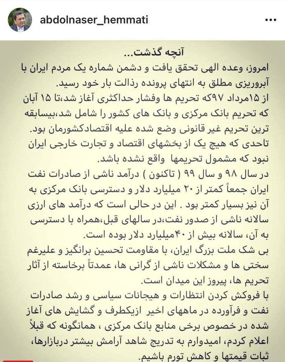 رئیس کل بانک مرکزی در صفحه اینستاگرام خود نوشت: امروز، وعده الهی تحقق یافت و دشمن شماره یک مردم ایران با آبروریزی مطلق به انتهای پرونده رذالت بار خود رسید.