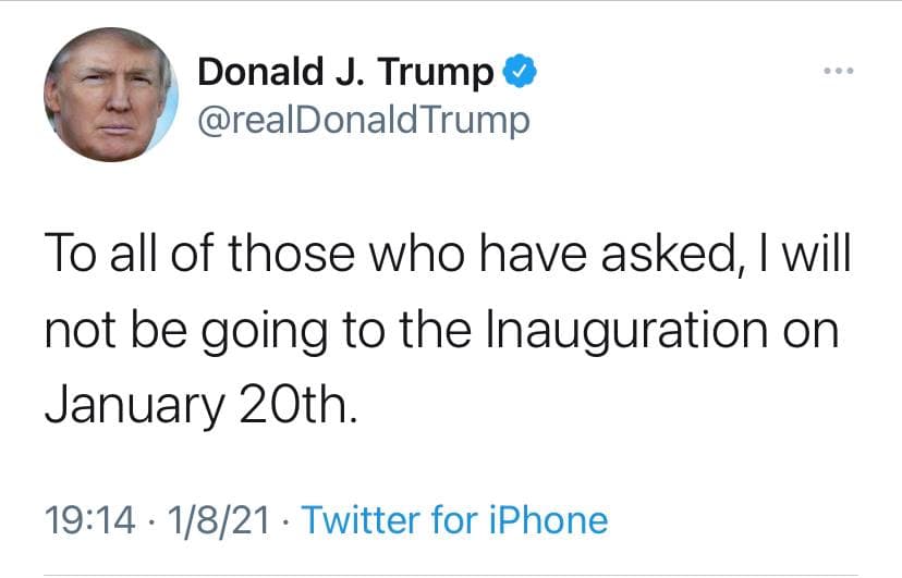 دونالد ترامپ رئیسجمهور آمریکا در توئیتی نوشت: خطاب به همه آنها که پرسیدهاند؛ من در مراسم تحلیف در روز بیستم ژانویه شرکت نخواهم کرد.