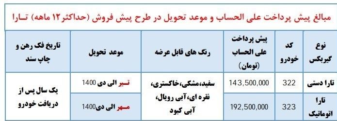 طــرح پــیش فــروش (حــداکثر 12 ماهــه) محصـول تــارا ( بــه روش قرعـه کشی) مط ـابق جــدول ذیل از روز شنبه مورخ 20-10-99 شروع و تا پایان روز دوشنبه مورخ 22-10-99 ادامه خواهد داشت. مطابق با بخشنامه شماره 4249 دریافت کد کاربری و کلمه عبور قبل از ثبت نام در سایت فروش اینترنتی از الزامات ثبت نام میباشد. لذا بدیهی است در صورت عدم دریافت کد کاربری و کلمه عبور،امکان ثبت نام میسر نخواهد بود.