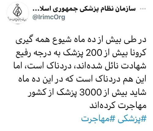 این حساب کاربری در توئیتی نوشت: "در طی بیش از ده ماه شیوع همه گیری کرونا بیش از ۲۰۰ پزشک به درجه رفیع شهادت نائل شدهاند، دردناک است، اما این هم دردناک است که در این ده ماه شاید بیش از ۳۰۰۰ پزشک از کشور مهاجرت کردهاند."