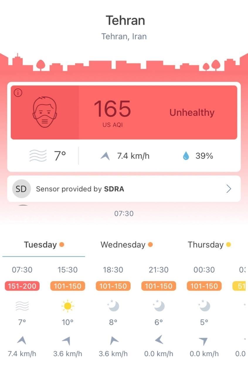 براساس اعلام شرکت کنترل کیفیت هوای تهران، درحال حاضر کیفیت هوای پایتخت با شاخص میانگین ۱۶۸ در شرایط ناسالم برای همه افراد است همچنین کیفیت هوا در تمامی مناطق تهران در وضعیت قرمز گزارش شده است.