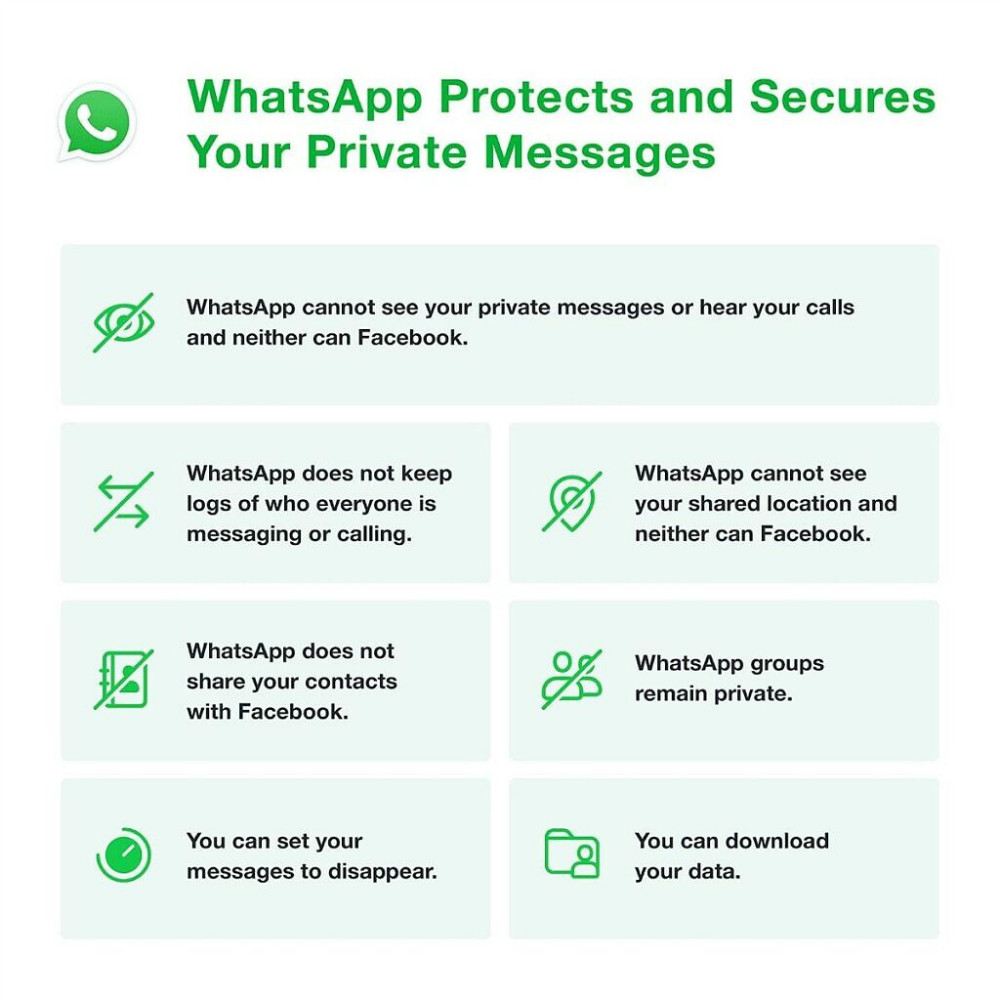 واتساپ همچنین مدعیست که سابقه مخاطبین پیامها و تماسهای شما را ذخیره نمیکند، به اشتراکگذاری لوکیشن بین کاربران دسترسی ندارد و اطلاعات تماسها را به فیسبوک نمیدهد. گروهها نیز همچنان محرمانه باقی خواهند ماند.
