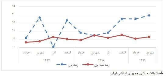 رشد قابل توجه پول نسبت به شبه پول باعث شده تا سهم پول از نقدینگی در شهریور 1399 به 21 درصد برسد که پس از سال 1391 این بالاترین سهم پول از نقدینگی است. تمایل به نگهداری پول به جای شبه پول، به معنای آن است که هریک ریال نقدینگی (قبلی و جدید(، در کوتاه مدت، پیامدهای تورمزایی بیشتری نسبت به قبل خواهد داشت.